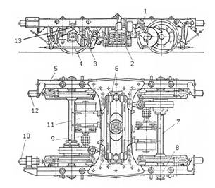 На первой тележке головного вагона дополнительно установлены: два рельсосмазывателя - РСЧ (рис. 4.5), две или четыре приёмных катушки системы АРС (рис 4.6), а также срывной клапан (рис 4.7).