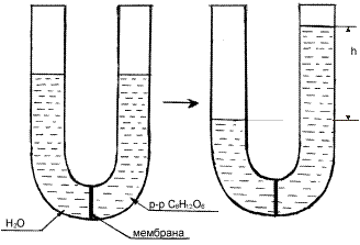 Явление осмоса можно наблюдать, если U-образную стеклянную трубку разделить на 2 части (2 колена) полупроницаемой перегородкой, способной пропускать через себя только молекулы растворителя. В одно колено (например, правое) следует поместить раствор какого-нибудь вещества (глюкозы), а в другое – растворитель (Н2О). При этом уровень жидкости по обе стороны мембраны должен быть одинаковым (рис. 22). Молекулы воды могут переходить через мембрану в обоих направлениях, однако будет наблюдаться их преимущественная диффузия из растворителя (где их концентрация больше) в раствор, вследствие чего уровень жидкости в левом колене станет постепенно понижаться, а в правом – наоборот, увеличиваться.