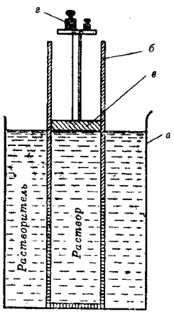 Рис. 24. Схема опыта, поясняющего измерение осмотического давления: а – сосуд с растворителем; б – сосуд с раствором, стенки которого образованы полупроницаемой мембраной; в – поршень;