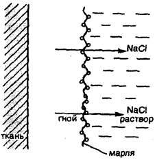 В клинической практике в некоторых случаях могут применяться не только изотонические, но и гипертонические растворы. Например, в хирургии используют марлевые полоски, смоченные в гипертоническом растворе NaCl, для наложения на гнойные раны. При этом вследствие осмоса ток жидкости направляется по марле наружу из раны, что способствует постоянному очищению раны от гноя, микроорганизмов, продуктов распада и т.д. (рис. 26).