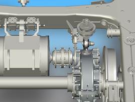-вал тягового двигателя; -ведущий кулачек; -цапфы кулачка; -игольчатые подшипники; -вырезы первого корпуса-вилки; -первый корпус-вилка; -призонные болты (4шт); -второй корпус-вилка; -вырезы второго корпуса-вилки; -игольчатые подшипники; -цапфы кулачка; -ведомый кулачек; -вал малой шестерни; -малая шестерня; -зубчатое колесо (через заципление зубьев); -ось колесной пары; -колеса; -ходовые рельсы.