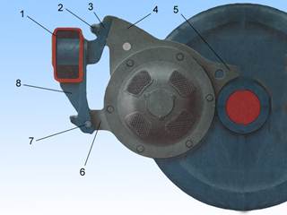 Верхние кронштейны (3) стальные, литые, имеют основание в виде полого цилиндра, которым они вварены в стенки поперечной балки. Их опорные плиты, приподнятые кверху, имеют клиновидные окончания, на которые надевают выступы предохранительных упоров ("лап") двигателя (4). При таком исполнении тяговый двигатель может висеть на кронштейнах даже без крепления болтами. Нижний упор (6) двигателя размещают в нижнем кронштейне (8), который также приварен к поперечной балке рамы тележки и имеет форму открытой коробки. Задняя наклонная стенка этой коробки служит опорной поверхностью для упоров двигателя, а боковые стенки, усиливающие кронштейн, расположены шире упора и благодаря этому позволяют перемещать двигатель вдоль его оси. Для этого в боковые стенки ввернуты стопорные болты (7), которые упираются с двух сторон в нижний упор. Отвертывая один из болтов и подтягивая другой, можно перемещать двигатель в ту или иную сторону и этим регулировать разбег карданной муфты. После регулировки каждый стопорный болт фиксируют контргайкой, а тяговый двигатель закрепляют на месте тремя стяжными болтами (2), для которых в кронштейнах и упорах двигателя выполнены овальные отверстия. Стяжные болты фиксируют корончатыми гайками со шплинтами. Таким образом, при такой рамной подвеске можно регулировать положение тягового двигателя только в направлении вдоль его оси. Остов двигателя имеет два предохранительных ребра (5), которыми двигатель может опереться на ось колесной пары в случае излома верхних точек подвески. При этом нижний упор опустится на дно коробки и этим удержит двигатель от падения на путь.