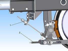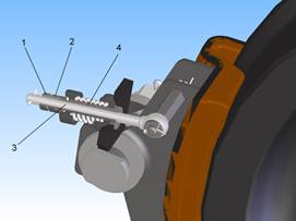 Для этого необходимо отвернуть контргайку (1) и вращая гайку (2) в одну или другую сторону переместить стержень (3) по втулке (4). Колодка связана со стержнем при помощи пальца, который крепится к колодке выше основного валика. Поэтому тормозная колодка начнет поворачиваться относительно основного валика.