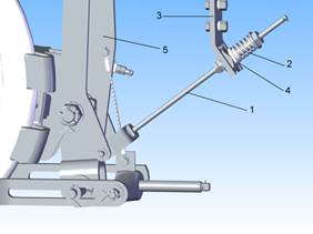 5 - концевой рычаг Стержень оттормаживающего устройства соединен с нижней частью подвески концевого рычага. При торможении концевой рычаг перемещается к колесу. Вместе с ним начинает перемещаться вниз относительно неподвижного кронштейна и стержень. Пружина начинает сжиматься. Рис. 9.10. Оттормаживающее устройство. В момент отпуска тормоза пружина начнет разжиматься и вместе с возвратной пружиной тормозного цилиндра будет способствовать быстрому отводу концевого рычага вместе с тормозной колодкой от колеса.