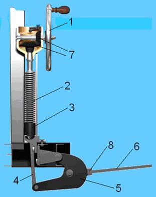Колонка ручного тормоза состоит из маховика с рукояткой (1), который через коническую пару шестерен (7) передает вращение винту (2). По винту поступательно вверх и вниз перемещается гайка (3), связанная тягами (4) с кривым рычагом (5) под рамой кузова.