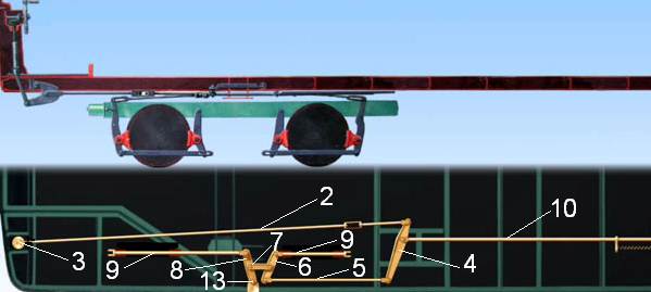 При вращении маховика по часовой стрелке кривой рычаг поворачивается вокруг своей оси, вызывая перемещение тяги (6) с регулировочной муфтой (8). Передача усилия от ручного тормоза к двум левым узлам тормоза второй тележки осуществляется длинной тягой, составленной из трех частей, скрепленных болтами. Усилие от колонки ручного тормоза передается через наклонные тяги следующим образом.