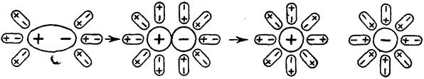 В этом случае диполи Н2О, ориентируясь соответствующим образом вокруг растворенной молекулы электролита, вызывают в ней дальнейшую поляризацию ковалентной связи, а затем и её окончательный гетеролитический разрыв (рис. 29).