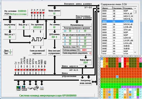 На рисунке 3.10 показано окно эмулятора микропроцессорной системы на МП КР580ВМ80А