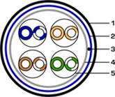 Например, кабель FTP (foiled twisted pair — витая пара с общим экраном из фольги и медным проводником для отвода наведенных токов), 4 пары (solid), категория 5e (рисунок 3.13). Кабель предназначен для стационарной прокладки внутри зданий, сооружений и эксплуатации в структурированных кабельных системах. Разработан для приложений, работающих в частотном диапазоне с верхней границей 100 МГц.