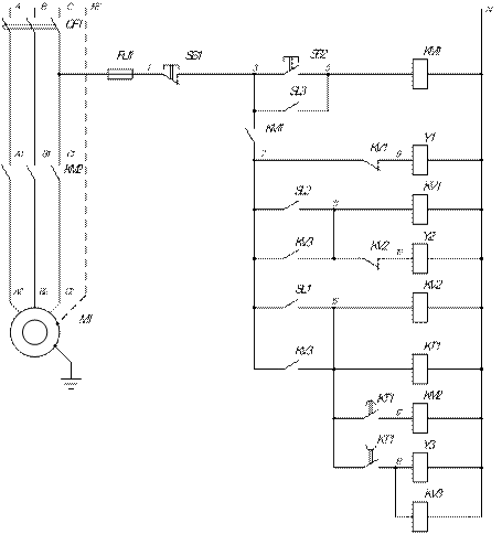 Исходя из технического задания (рисунок 2.5 часть 1 «Основы автоматики»), составим классическую релейно-контакторную схему (рисунок 3.20).