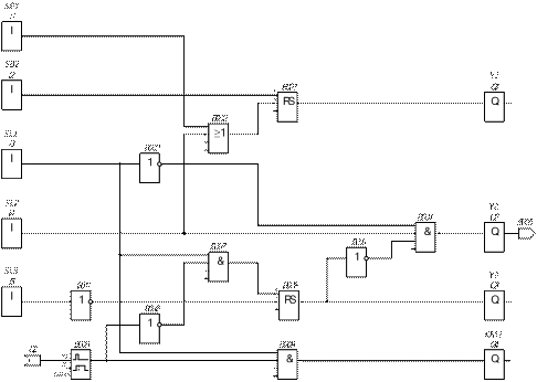 На рисунке 3.22 представлен вариант коммутационной схемы контроллера смесительного устройства, созданный в среде LOGO!Soft Comfort. При создании коммутационной программы связываем соединительные элементы с блоками. Простейшими блоками являются логические операции. Также в схеме использованы триггеры и блок задержки выключения.