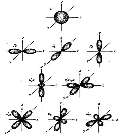 | Рис. 1.1 Форма и пространственная ориентация электронных облаков s-, p- и d-орбиталей. |