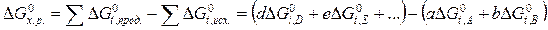 равно разности между суммой стандартных энергий Гиббса образования продуктов реакции и суммой стандартных энергий Гиббса образования исходных веществ: