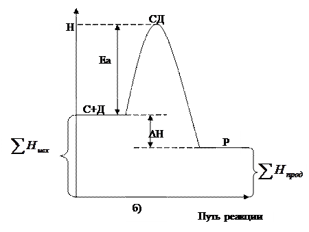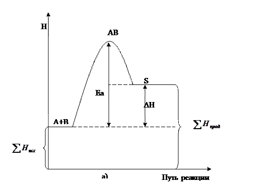 На рисунке а) видно, что продукты реакции обладают большим запасом энергии, чем исходные вещества, то есть реакция А + В ® S эндотермическая. Разность между энергией продуктов реакции и исходных веществ является тепловым эффектом реакции
