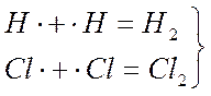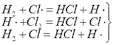 За счет внешнего источника энергии (свет, электрический разряд, нагревание, воздействие ά-, β- или γ- излучения) образуются свободные радикалы или атомы, обладающие свободными валентностями. Они взаимодействуют с молекулами. В каждом звене цепи вновь образуется новая активная частица. Путем повторения одних и тех же элементарных процессов происходит протекание цепной реакции. Ее продолжительность может быть очень большой. В приведенной выше реакции на каждый поглощенный квант образуется до 100 тыс. молекул НСl. Столкновение двух одинаковых радикалов при условии, что выделяющаяся при этом энергия может быть отдана третьему телу, приводит к обрыву цепи. Причиной обрыва может служить не только рекомбинация свободных радикалов, но и их захват стенкой реакционного сосуда, взаимодействие радикала с примесями, а также образование малоактивного радикала (обрыв в объеме). Поэтому скорость цепной реакции очень чувствительна к наличию посторонних частиц и форме сосуда.