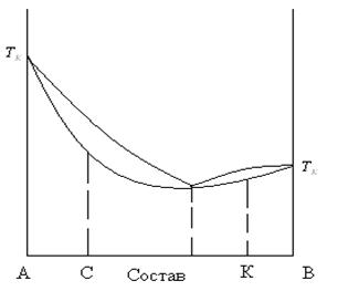 Если взять эту же смесь состава «К», то при нагревании вновь в паровую фазу будет в основном переходить азеотроп, жидкая фаза будет обогащаться компонентом В.