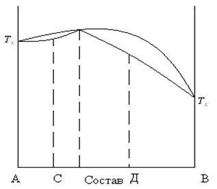 При нагревании раствора, имеющего азеотроп с максимумом температуры кипения жидкая фаза обогащается азеотропной смесью (высококипящая часть), а в паровую фазу в большей степени будет поступать компонент А или В в зависимости от состава исходной смеси. Если смесь имела состав «С», то отгоняться будет компонент А; если смесь имела исходный состав «Д», то отгоняться будет компонент «В».