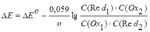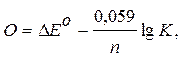 При подстановке численных значений R = 8,314 Дж/(моль×К), F=96494 Кл и Т (298 К) и замене натуральных логарифмов на десятичные уравнение упрощается: