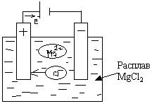 Электролиз расплава соли с использованием инертных электродов показан на следующей схеме: