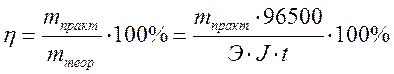 Показателем эффективности электролиза является выход по току η, %, определяемый как отношение массы вещества, фактически полученной в данных условиях электролиза mпракт, к массе вещества, теоретически вычисленной на основании закона Фарадея mтеор:
