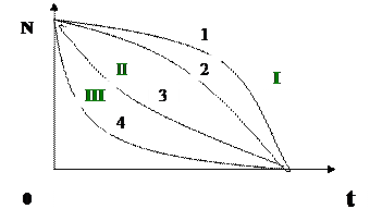 Рис. 5.2 Типы кривых выживания (1-дрозофила, 2-человек, 3-гидра, 4-устрица, n – количество особей, которые выживают).