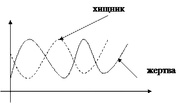 Система “хищник-жертва” – обе взаимодействующие популяции оказывают влияние на численность и плотности населения друг друга. Идеальным результатом такого взаимодействия оказывается формирование повторяющихся подъемов и складов численности обоих видов, причем в этой системе колебаний изменение численности хищника отстают по фазе от динамики популяции жертвы (см. рис. 5.5).