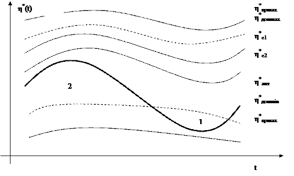 Допустимой мерой отклонения от нормального состояния η*е1 экосистемы считается такое отклонение, которое со временем может быть ликвидировано самой системой. Достижение критического уровня η*кp.max(min) ведет к разрешению расширению данной экосистемы. Изменения η*(t) во времени обусловлено изменением внешних условий – температуры, влажность и т.д. Множество состояний экосистем η*е2 лежит между η*кp.max и η*кр.min.
