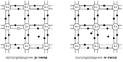 При введении в полупроводник примесей - донорных (элементы 5-й группы: фосфор, мышьяк, сурьма) или акцепторных (элементы 3-й группы: бор, индий, алюминий) резко увеличивается количество свободных носителей зарядов – электронов и дырок.