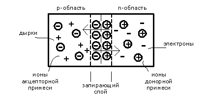 При соприкосновении полупроводников с различным типом электропроводности в пограничном слое происходит рекомбинация электронов и дырок, в результате чего образуется слой, лишенный подвижных носителей заряда и поэтому обладающий высоки электрическим сопротивлением. Этот слой называется запирающим.