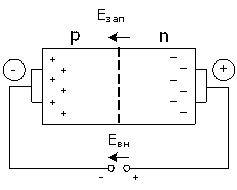 Кроме того, по обе стороны границы соприкосновения создается объемный заряд: в p-области образованный отрицательно заряженными ионами акцепторной примеси, в n-области – положительно заряженными ионами донорной примеси (рис. 6). Это приводит к возникновению контактной разности потенциалов (десятые доли – единицы вольт) и соответственно электрического поля Езап.