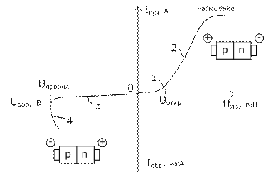 Обратная ветвь характеристики Iобр=f(Uобр) соответствует закрытому состоянию перехода. Участок 3 - запирающий слой препятствует движению свободных носителей и ток мал, 4 - пробой p-n-перехода, ток резко возрастает.