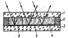 На рис. 40 представлен ЖКИ, работающий на отражение. Индикаторы такого типа применяются в наручных электронных часах, микрокалькуляторах и других устройствах. Между двумя стеклянными пластинками 1 и 3, склеенными с помощью полимерной смолы 2, находится слой жидкого кристалла 4 толщиной 10 - 20 мкм. Пластинка 3 покрыта сплошным проводящим слоем (электрод 5) с зеркальной поверхностью. На пластинку 1 нанесены прозрачные слои — электроды А, Б, В, от которых сделаны выводы, не показанные на рисунке. Эти электроды имеют форму цифр, или букв, или сегментов для синтезирования различных знаков.