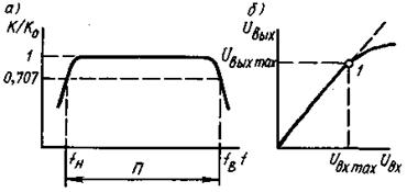 Рисунок 41 - Амплитудно-частотная (а) и амплитудная (б) характеристики усилителя