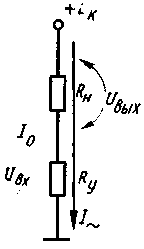 При отсутствии входного сигнала (Uвх = 0) в цепи проходит постоянный ток I0 = Eк/(Rн + Ry). При появлении входного сигнала изменяется сопротивление резистора Ry, а следовательно, полное сопротивление цепи и ток в ней, т. е. кроме постоянной составляющей тока в цепи появляется переменная составляющая I~. Если сопротивление управляемого элемента Ry изменяется строго пропорционально напряжению Uвх, то и ток I~ пропорционален напряжению Uвх. Следовательно, падение напряжения Uвых на резисторе нагрузки Rн, создаваемое переменной составляющей тока I~, также пропорционально входному напряжению Uвх, т. е. Uвых = К∙Uвх, где К - коэффициент усиления напряжения.