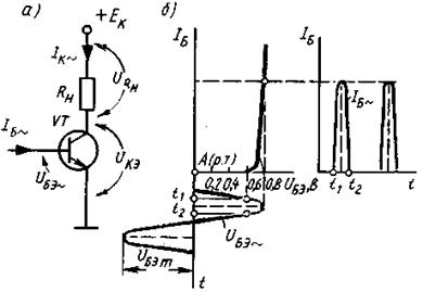 Под действием входного сигнала Uбэ~ транзистор будет открыт только в течение части t1 - t2 положительного полупериода сигнала При этом транзистор откроется и его коллекторный ток Iк~ вызовет напряжение URн на резисторе нагрузки Rн. Во время действия отрицательной полуволны входного сигнала Uбэ~ транзистор будет закрыт. Поэтому усиленный выходным сигналом будет существенно отличатся по форме от входного.