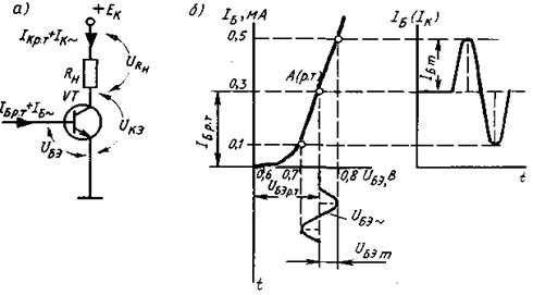 Для получения выходного сигнала с минимальными нелинейными искажениями следует выбрать такое положение рабочей точки, при котором каждому значению входного сигнала Uбэ~ будет соответствовать значение выходного. Схема такого каскада усиления и графическое представление его работы показаны на рис. 44, а, б. Напряжением постоянного смещения Uбэ=0,75 В рабочая точка выводится на середину прямолинейного участка входной характеристики транзистора.