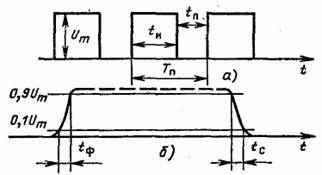 В реальных устройствах прямоугольные импульсы имеют (рис. 35, б) определенную длительность фронта tф и среза tc. Как правило, фронт и срез импульса определяются в течение нарастания (или спада) напряжения от 0,1Um до 0,9Um.