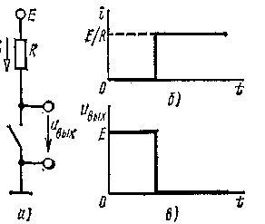 Рисунок 36 - Схема (а), временные диаграммы тока (б) и выходного напряжения (в) идеального ключа