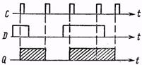 D-триггер (от англ. delay – задержка) имеет один информационный вход и тактируемый (синхронизирующий) вход (рис. 59). D-триггер запоминает и хранит на выходе Q сигнал, который был на информационном входе D в момент прихода тактового импульса С. Т.о. триггер хранит информацию, записанную при С=1.