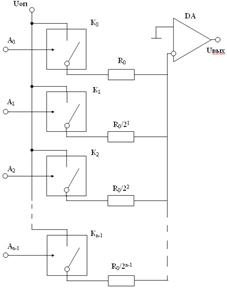 Резистор Ri подключается к источнику питания с опорным напряжением Uоп через электронный ключ, который замкнут при Аi=1 и разомкнут при Аi=0. Чем старше разряд, тем меньше сопротивление и больше ток (напряжение).