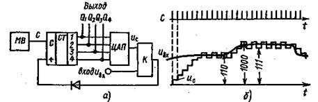 АПЦ состоит из мультивибратора, генерирующего тактовые импульсы С (рис. 73, 6), реверсивного счетчика, подсчитывающего тактовые импульсы, ЦАП и компаратора К. Реверсивный счетчик работает на сложение при подаче сигнала 1 на вход «+» и на вычитание при сигнале 0 на названном входе.