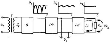 Выпрямитель В, состоящий из выпрямительных диодов, преобразует переменное напряжение U2 в постоянное пульсирующее напряжение U3, а сглаживающий фильтр СФ преобразует его в постоянное напряжение U4 с небольшими пульсациями. Напряжение U4, может быть использовано для питания каскадов аппаратуры, нормально работающих и при пульсациях (например, оконечных каскадов усилителей мощности звуковой частоты).