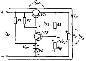 Принцип регулирования выходного напряжения URн основан на изменении проводимости регулирующего транзистора VT1.