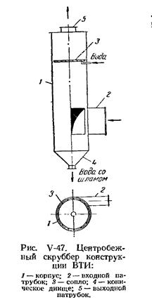 Запыленный газ через конфузор трубы Вентури попадает в горловину, где его скорость достигает 60-150м/с. Через отверстие под избыточным давлением в горловину попадает жидкость, которая сталкивается с потоками газов. При соударении с частицами пыли капли, поглощая их укрупняются. Эти капли вместе с газом проходят диффузор и попадают в аппарат, в нем капли под действием центробежных сил отделяются от газов и вместе со шлаком удаляются в отстойник, где вода отделяется от шлака.