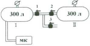 1)закрыть все краны, включить МК и, после достижения давления в 1-м резервуаре до 8атм, полностью открыть кран З, а кран 1 приоткрыть так, чтобы величина давления в 1-м резервуаре сохранилась 8атм;