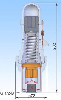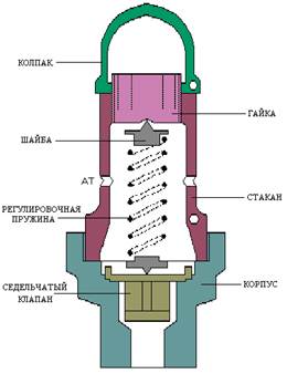 -Регулировочный винт ввернут в стакан сверху, необходим для изменения усилия регулировочной пружины и, следовательно, давления, при котором срабатывает клапан.