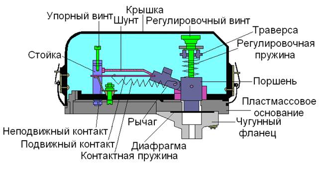 Между чугунным фланцем с входным штуцером и пластмассовым основанием установлена резиновая диафрагма, нагруженная сверху через упорный поршень регулировочной пружиной. Регулировка ее усилия на диафрагму осуществляется с помощью регулировочного винта, по резьбе которого перемещается гайка, запрессованная в пластмассовую рейку. Если вращать регулировочный винт против часовой стрелки, рейка начнет движение вниз по резьбе винта, тем самым, усиливая действие регулировочной пружины на диафрагму сверху. Упорный поршень имеет возможность двигаться вверх и вниз по пластмассовой направляющей. С поршнем при помощи оси связан изогнутый рычаг, который поворачивается на оси.
