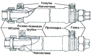 При сборке одного рукава под головку одного из болтов на хомутах устанавливают металлическую бирку с клеймом ОТК. При этом по нормам эксплуатации зазор между ушками хомутов должен быть 7-16мм. Такое же расстояние должно быть между хомутом и торцом резино-тканевой трубки. Далее рукав подвергается испытанию на воздухопроницаемость в водяной ванне при давлении воздуха 10атм в течении 1мин, появление пузырьков воздуха не допускается. Затем белой краской на рукав наносят дату испытания.