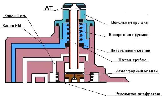 - Питательный клапан. На полой, латунной трубке установлено металлическое кольцо с резиновым уплотнением, которое является питательным клапаном. Седлом питательного клапана является втулка, запрессованная внутри корпуса питательного узла ВР. Нижний торец полой трубки является подвижным седлом атмосферного клапана. Канал полой трубки ведет в атмосферу, через 7 атмосферных отверстий в верхней цокольной крышке ВР. Внизу, полая трубка имеет треугольное направляющее сечение для свободного прохода воздуха. Питательный клапан имеет возвратную пружину сверху.