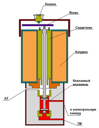 При снятии напряжения с катушки ВЗ №2, электромагнитная сила пропадает, и шток с клапанами усилием возвратной пружины снизу перемещается вверх. Верхний клапан отсекает магистральную камеру от атмосферы, а нижний клапан сообщает её с тормозной магистралью. При этом происходит быстрая зарядка магистральной камеры воздухом из тормозной магистрали и отпуск тормоза.